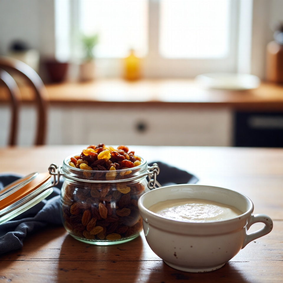 Coloque as passas hidratadas em uma tigela pequena ao lado do copo. Para enriquecer ainda mais o valor nutricional, sirva com um punhado de oleaginosas saudáveis, como amêndoas ou nozes.
