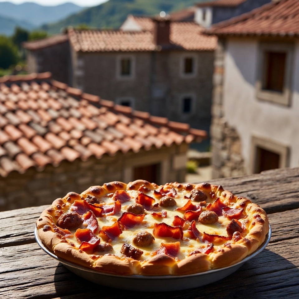 - Distribua por cima o bacon crocante e as rodelas de linguiça, espalhando de forma uniforme.
