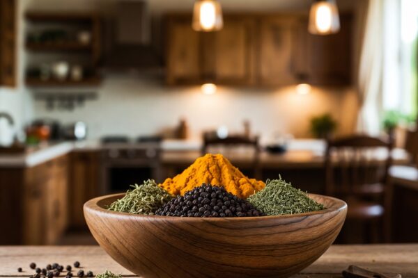 • Pimenta‑preta: Estimula a digestão e aumenta a absorção da curcumina, o principal ativo da cúrcuma.