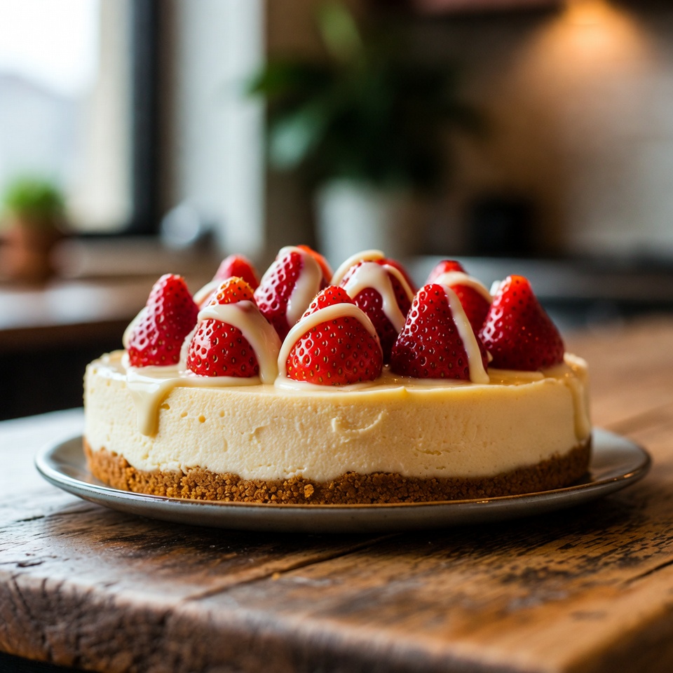 Delicie-se com este irresistível Cheesecake de Chocolate Branco com Morangos: uma sobremesa cremosa, com base crocante, recheio sedoso de cream cheese e chocolate branco, finalizada com uma cobertura fresca de morangos. Perfeito para ocasiões especiais ou simplesmente para se presentear com algo especial.