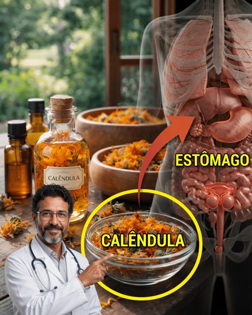 Além do uso tópico, a calêndula também aparece em práticas tradicionais voltadas ao conforto digestivo. O chá de calêndula é popular em situações leves, como: