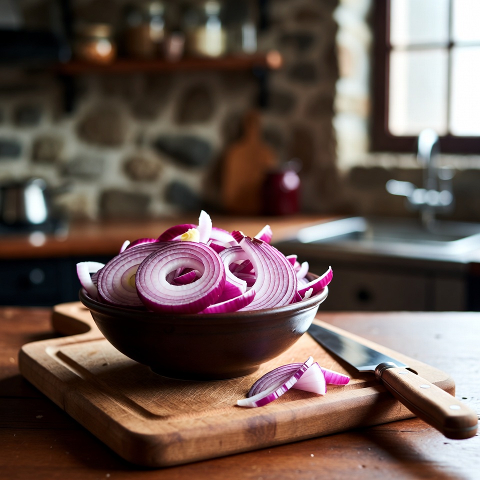 - Descasque a cebola roxa e corte em fatias finas.